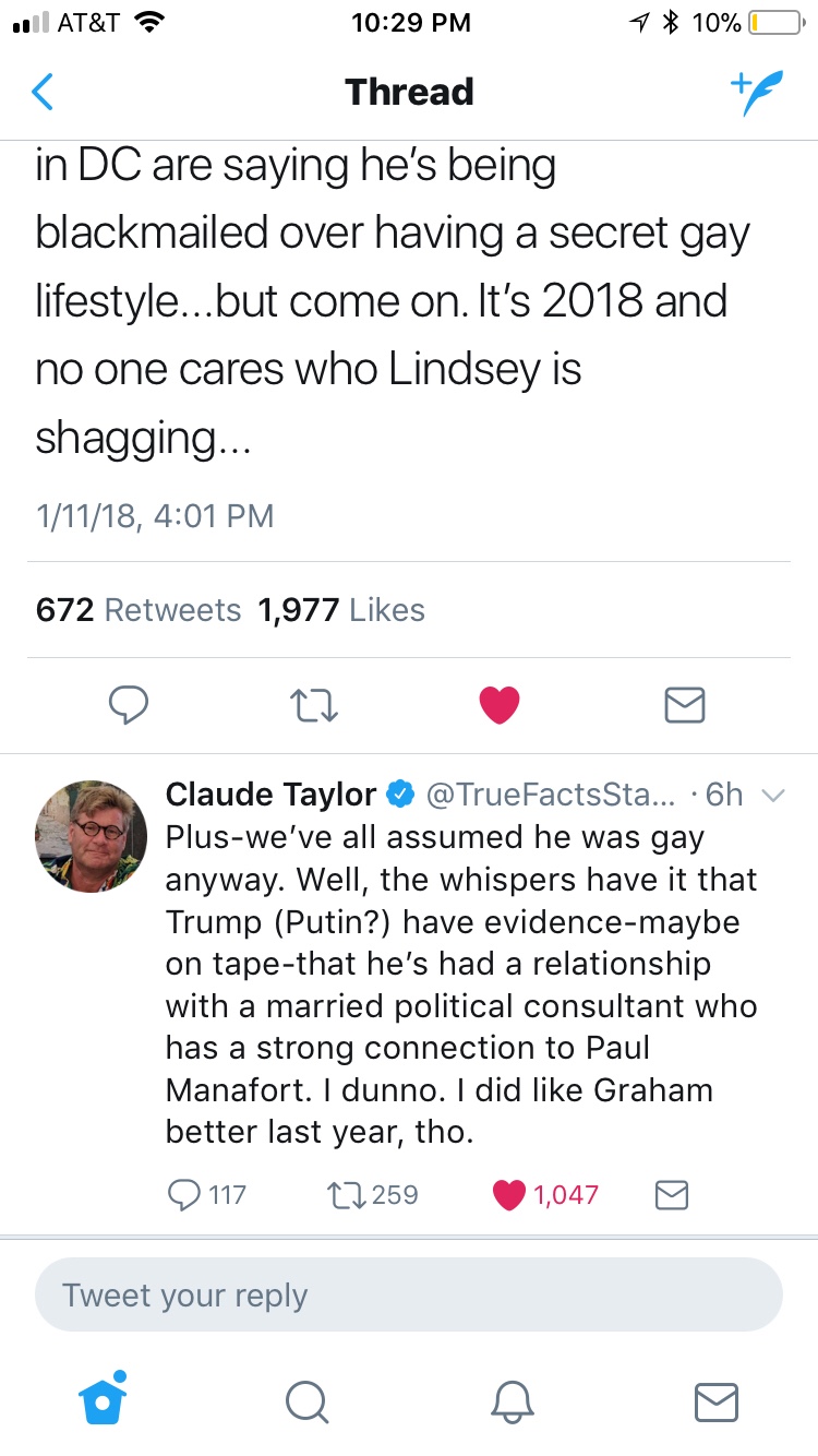 Then again, he could be getting blackmailed for his connections to Chris Ferry, who used to work for Paul Manafort, and was on Lindsey’s campaign.