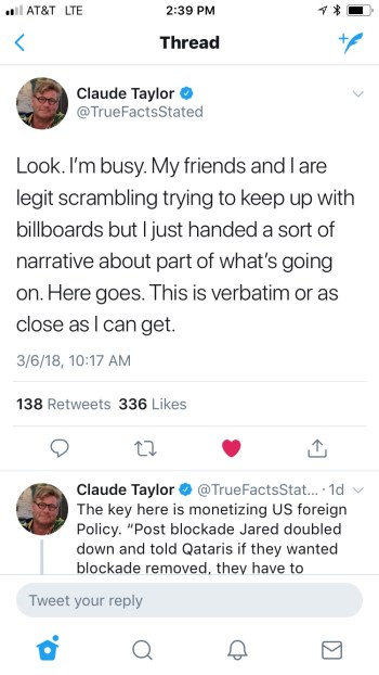 I’m wondering if he’s going to try some type of Quid Pro Quo crap that he pulled with Qatar. See Claude’s tweet below for details.