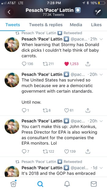 I hate to say this, so here’s a screenshot of Pace’s Twitter timeline. I couldn’t find the original, but get ready for news about Trump Dick Pics.