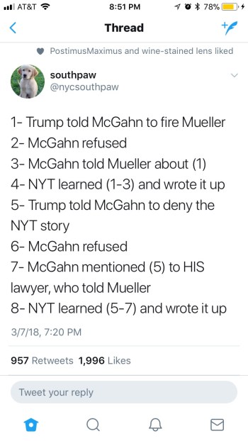 Keep in mind, this is Trump asking the witnesses AFTER they testified to Mueller, not before, so it likely doesn’t meet the legal standard for Witness Tampering or Intimidating a Witness. However, Mueller is circling back to ask the witnesses what Trump said and did to them. If Trump threatened them, or tried to force them to change their stories, or intimidated them in any way, shape, or form, that’s a padddlin’.