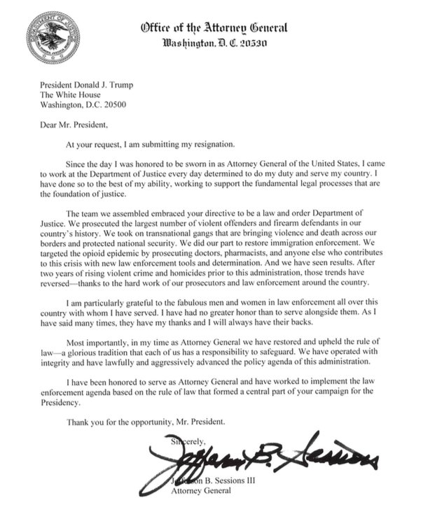 1/ Today Trump fired Attorney General Jeff Sessions. The letter above is written as a “resignation” by Sessions, but it makes clear in the first line that Sessions resigned at Trump’s request. This has been rumored for months, so it doesn’t come as a surprise.